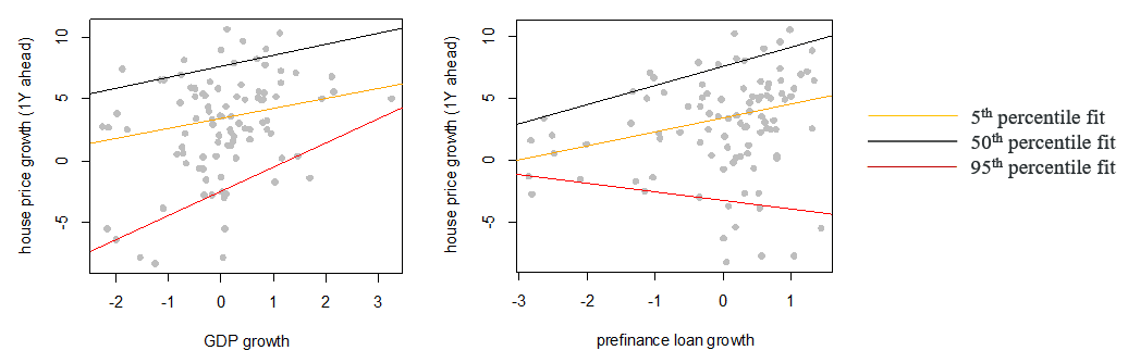 โดยปกติ เรามักจะคาดการณ์ราคาที่อยู่อาศัยจากภาวะเศรษฐกิจในปัจจุบัน เช่น หากรายได้ของคนในประเทศเพิ่มขึ้น ย่อมทำให้ราคาที่อยู่อาศัยมีแนวโน้มสูงขึ้นตามความต้องการที่มากขึ้น อย่างไรก็ตาม ความสัมพันธ์ดังกล่าวอาจไม่เรียบง่ายเช่นนั้นเสมอไป IMF (2019) พบว่า ความสัมพันธ์ระหว่างภาวะเศรษฐกิจและราคาที่อยู่อาศัยคาดการณ์ในช่วงวิกฤติแตกต่างจากความสัมพันธ์ในภาวะปกติ โดยความสัมพันธ์ที่ไม่เป็นเส้นตรง (nonlinear relationship) เช่นนี้พบได้ในกรณีของไทยเช่นกัน สะท้อนจากการขยายตัวทางเศรษฐกิจ (GDP growth) ที่มีความสัมพันธ์กับราคาที่อยู่อาศัยหนึ่งปีข้างหน้าในช่วงวิกฤต (ราคาที่ 5th percentile) สูงกว่าช่วงปกติ (ราคาที่ 50th percentile) กล่าวคือ อุปสงค์ที่อยู่อาศัยที่ลดลงตามเศรษฐกิจที่หดตัวมีส่วนทำให้ราคาที่อยู่อาศัยหนึ่งปีข้างหน้าลดลง แต่มีแนวโน้มที่ราคาจะลดลงอย่างรุนแรงในช่วงวิกฤต โดยเปรียบเทียบกับในช่วงปกติ ในอีกด้านหนึ่ง อุปสงค์ที่เพิ่มขึ้นตามเศรษฐกิจที่ขยายตัวได้ดีช่วยให้ราคาที่อยู่อาศัยหนึ่งปีข้างหน้าขยายตัวได้ โดยจะส่งผลดีต่อราคาที่อยู่อาศัยที่ 5th percentile มากกว่าราคาที่ 50th percentile นอกจากนี้ความสัมพันธ์ระหว่างอัตราการเติบโตของสินเชื่อเพื่อพัฒนาที่อยู่อาศัย (prefinance loan growth) และราคาที่อยู่อาศัยในช่วงหนึ่งปีข้างหน้า ที่ในภาวะปกติการขยายตัวของสินเชื่อจะทำให้ราคาเพิ่มขึ้น กลับพบความสัมพันธ์ตรงกันข้ามในภาวะวิกฤติ หรือกล่าวได้ว่า ราคาที่อยู่อาศัยในหนึ่งปีข้างหน้าอาจลดลงได้แม้ว่าสินเชื่อเพื่อที่อยู่อาศัยจะขยายตัวก็ตาม (รูปที่ 1)
