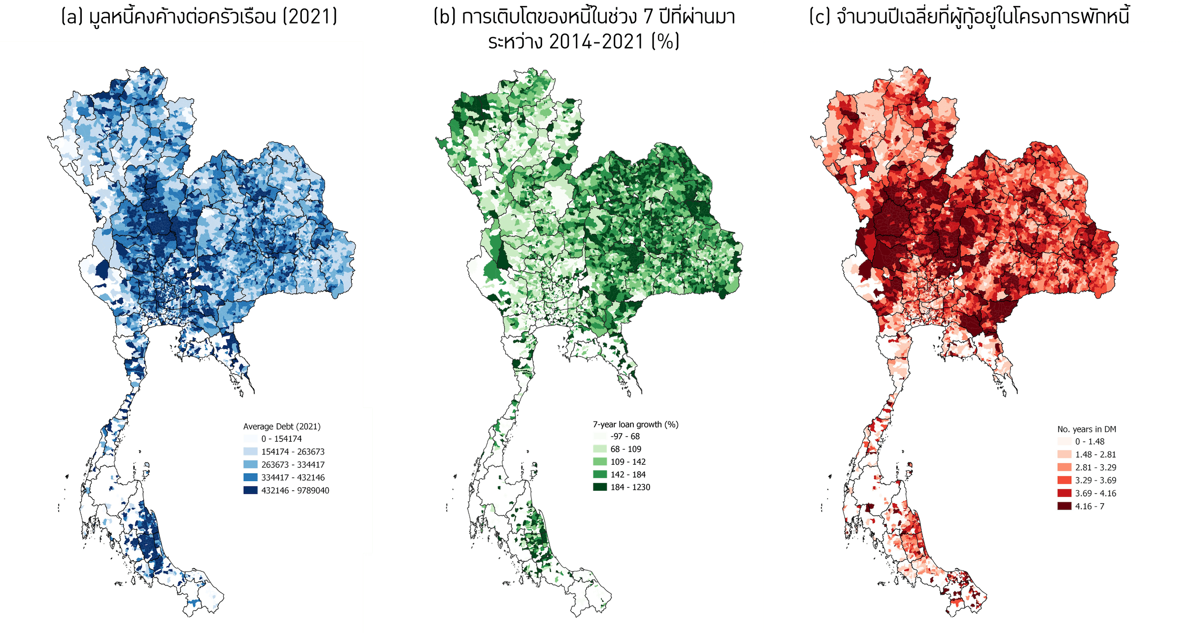 ครัวเรือนที่มีหนี้มากมักเป็นครัวเรือนที่พึ่งพิงภาคเกษตรสูงและมีปัญหาสภาพคล่องสูง ในขณะเดียวกันหนี้โตเร็วโดยเฉพาะในครัวเรือนที่มีความเสี่ยงสูง โดยรูปที่ 8a แสดงให้เห็นว่าครัวเรือนในภาคเหนือตอนล่างและกลางตอนบนซึ่งเป็นแหล่งชลประทาน มีรายได้มาจากภาคเกษตรสูง ต้นทุนการทำเกษตรสูง และมักมีปัญหาสภาพคล่องสูง จะมีหนี้สินเฉลี่ยต่อครัวเรือนสูงกว่าภูมิภาคอื่น ๆ ในขณะที่รูปที่ 8b แสดงให้เห็นว่าครัวเรือนในภาคตะวันออกเฉียงเหนือและหลายพื้นที่ในภาคกลางซึ่งเป็นพื้นที่ที่มีสถิติการเกิดผลผลิตตกต่ำจากภัยพิบัติสูง จะมีอัตราการเติบโตของหนี้สูงกว่ากลุ่มอื่น ๆ ซึ่งก็สอดคล้องกับผลการศึกษาจากข้อมูลใน Chantarat et al. (2022) นอกจากนี้ รูปที่ 8c ยังแสดงให้เห็นว่าครัวเรือนเกษตรกรมีการเข้าร่วมมาตรการพักหนี้ในวงกว้าง และโดยเฉพาะครัวเรือนกลุ่มที่มีปัญหาหนี้เหล่านี้