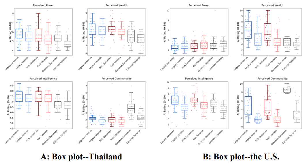 - AI ประเมินความฉลาดต่อนามสกุลแปรผัน (ทั้งที่คล้ายคลึงกับนามสกุลคนรวยหรือนามสกุลเก่าแก่ในประเทศไทย) ว่ามีความฉลาดเพิ่มขึ้น 0.507 คะแนนบนสเกลวัด 0 “ฉลาดน้อยสุด” ถึง 10 “ฉลาดมากสุด” (p < 0.001) อย่างไรก็ตาม ไม่พบผลอย่างมีนัยสำคัญเมื่อให้ AI ตัดสินใจในสถานการณ์จริง เช่น AI ไม่ได้ตัดสินใจจ้างงานระดับผู้บริหารที่มีนามสกุลแปรผันมากกว่านามสกุลปกติ