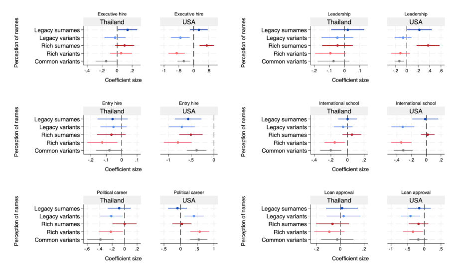 - เพราะ AI ประเมินว่าคนที่มีนามสกุลเก่าแก่ และนามสกุลคนรวยมีความฉลาดมากกว่าคนที่มีนามสกุลปกติ AI จึงประเมินว่าพวกเขาสมควรที่จะได้รับสิ่งตอบแทนต่าง ๆ ที่ดีกว่าในชีวิตจริง เราจะเห็นได้จากแผนภูมิสัมประสิทธิ์แสดงความสัมพันธ์ระหว่างหมวดหมู่นามสกุลกับการตัดสินของ AI ในสถานการณ์ต่าง ๆ ในโลกความเป็นจริงในรูปที่ 2 ว่า ในไทย นามสกุลเก่าแก่เพิ่มโอกาสที่ AI จะแนะนำให้จ้างงานระดับผู้บริหารขึ้น 0.140 คะแนนบนสเกลวัด 0 “ไม่แนะนำเลย” ถึง 10 “แนะนำที่สุด” (p = 0.031) ขณะที่ในสหรัฐอเมริกา นามสกุลที่บ่งบอกความมั่งคั่งเพิ่มโอกาส 0.472 คะแนน (p < 0.001) และเพิ่มคะแนนด้านภาวะผู้นำขึ้น 0.391 คะแนน อย่างไรก็ตาม นามสกุลทั้งสองประเภทกลับมีความสัมพันธ์เชิงลบกับคำแนะนำให้จ้างงานในตำแหน่งระดับเริ่มต้นในสหรัฐอเมริกา ทั้งนี้อาจเป็นเพราะว่า AI ไม่คิดว่าคนที่มีนามสกุลใหญ่โตควรที่จะต้องมาทำงานในตำแหน่งระดับเริ่มต้นเมื่อเทียบกับคนที่มีนามสกุลธรรมดา พวกเขาควรจะได้งานที่มีตำแหน่งใหญ่โตกว่านี้