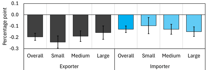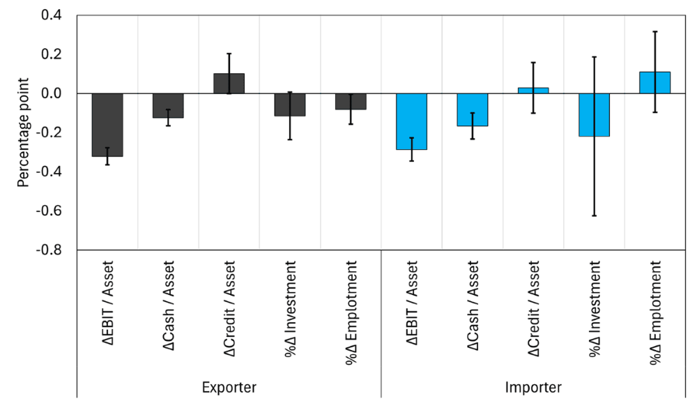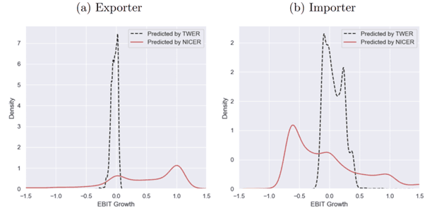 ธุรกิจที่พึ่งพาการค้าระหว่างประเทศสูงจะมีอัตรากำไรที่อ่อนไหวมากต่อช่องทาง valuation โดย Nookhwun et al. (2025) วัดการพึ่งพาการค้าระหว่างประเทศของแต่ละบริษัทจากสัดส่วนของรายได้จากการส่งออกต่อรายได้รวมในกรณีของผู้ส่งออก และสัดส่วนของต้นทุนจากการนำเข้าสินค้าต่อต้นทุนรวมในกรณีของผู้นำเข้า ผลการศึกษาพบว่า บริษัทที่พึ่งพารายได้จากการส่งออกหรือค่าใช้จ่ายในการนำเข้าสูง จะเผชิญกับผลกระทบจากการเคลื่อนไหวของ NICER เพิ่มขึ้นมาก ดังแสดงในรูปที่ 4 โดยหาก NICER เพิ่มขึ้น 1% จะส่งผลให้อัตรากำไรของทั้งผู้ส่งออกและนำเข้าลดลงมากขึ้นถึง 0.3%