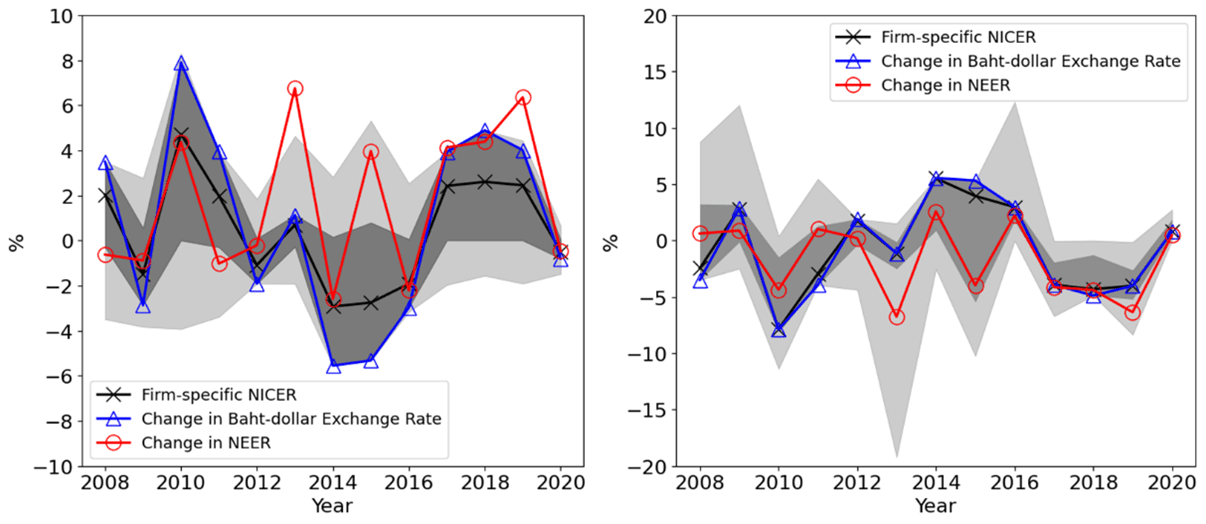 NICER ส่งผลต่อกำไรของบริษัทมากกว่าอัตราแลกเปลี่ยนเงินบาทเทียบกับสกุลเงินของประเทศคู่ค้า (Trade-weighted Exchange Rate หรือ TWER) จากรูปที่ 3 ซึ่งแสดงการกระจายตัวของอัตรากำไรของบริษัทในปี 2558 ที่ประมาณค่าจาก NICER (เส้นทึบสีแดง) เปรียบเทียบกับที่ประมาณค่าด้วย TWER (เส้นประสีดำ) พบว่า NICER สามารถอธิบายกำไรของบริษัทได้ดีกว่ามาก เห็นได้จากอัตรากำไรที่ประมาณค่าจาก NICER กระจายตัวมากกว่าในกรณีที่ประมาณค่าด้วย TWER ค่อนข้างมาก และเมื่อเปรียบเทียบกับการกระจายตัวของอัตรากำไรของบริษัทที่เกิดขึ้นจริงในช่วงปี 2550–2563 ผลวิจัยพบว่า NICER อธิบายการกระจายตัวที่เกิดขึ้นจริงดังกล่าวได้เฉลี่ยประมาณ 3–4% ขณะที่ TWER อธิบายได้เพียง 0.5–2% (ดูเพิ่มเติมได้ใน Nookhwun et al. (2025) ตารางที่ 3) ทั้งนี้ ความสามารถของ NICER ในอธิบายอัตรากำไรของบริษัทนั้นเห็นได้ชัดเจนในกรณีของบริษัทส่งออก สอดคล้องกับขนาดผลกระทบของ NICER ต่อกำไรของผู้ส่งออกที่มีขนาดใหญ่กว่าดังแสดงในรูปที่ 2 ผลลัพธ์ที่ได้นี้บ่งชี้ถึงความสำคัญของผลกระทบของค่าเงินผ่านช่องทาง valuation ที่อาจมีความสำคัญกว่าช่องทางการค้าในบริบทของประเทศไทย