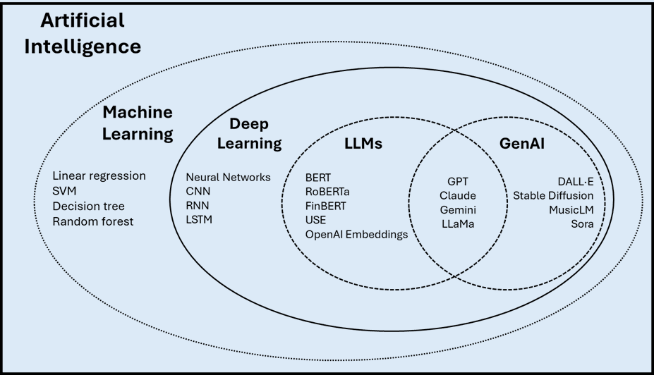 GenAI และ LLMs ถูกพัฒนาบนเทคนิค Deep Learning (DL) ซึ่งเป็นการใช้โครงข่ายประสาทเทียม (neural networks) หลายชั้นเพื่อเรียนรู้การแปลงข้อมูลดิบที่ซับซ้อน โดยไม่ต้องพึ่งการออกแบบตัวแปร1 ภายในกลุ่ม DL นี้ หนึ่งในสถาปัตยกรรมที่สำคัญ คือ Transformer ซึ่งมีกลไก attention ที่ช่วยให้แบบจำลองให้ความสนใจกับบริบทที่สำคัญของข้อมูลเป็นพิเศษมากกว่าที่จะให้ความสำคัญกับปริมาณหรือความถี่