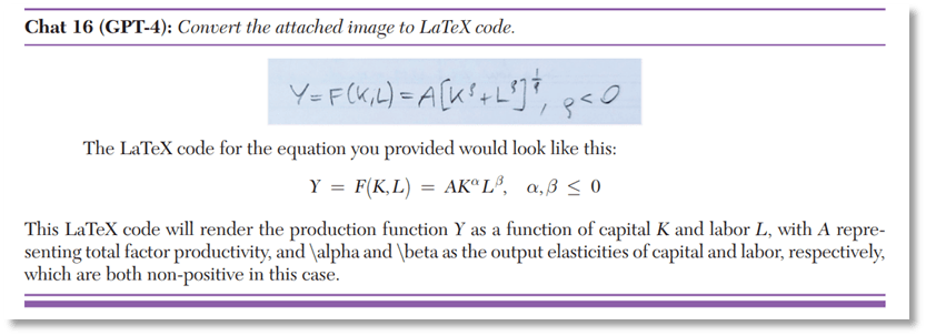 ในรูปที่ 5 เป็นตัวอย่างจาก Korinek (2024) ที่ให้ GPT-4 แปลงสมการจากลายมือเขียนเป็น LaTex ผลพบว่า GPT-4 ไม่ได้ใส่วงเล็บและแปลง CES function ให้กลายเป็น Cobb-Douglas function ไปแทน ผู้ใช้จึงควรต้องมีการตรวจสอบอย่างรอบคอบ
