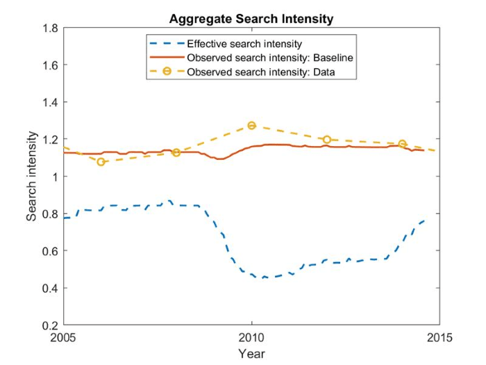 - ผลที่ตามมาคือ หากใช้ข้อมูลความขยันหางานที่สังเกตได้เพียงอย่างเดียว อาจทำให้ประเมินผิดว่าประสิทธิภาพการจับคู่ในตลาดแรงงานระหว่างนายจ้างและลูกจ้าง ลดต่ำเกินความเป็นจริงถึง 18 เปอร์เซ็นต์ ในช่วงวิกฤตดังกล่าว