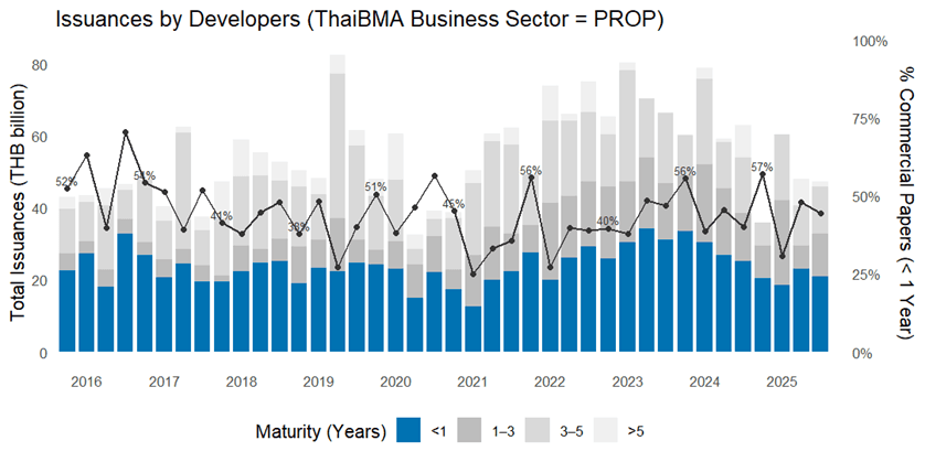 จะเห็นได้ว่าหลังจากการชะลอตัวในช่วงวิกฤต COVID-19 (ปี 2020) ผู้พัฒนากลับมาออกตราสารหนี้อย่างต่อเนื่อง โดยมูลค่าการออกตราสารหนี้ใหม่อยู่ที่ระดับ 60–80 พันล้านบาทต่อไตรมาส ที่น่ากังวลคือสัดส่วนของตั๋วเงิน (commercial papers ที่มีอายุน้อยกว่า 1 ปี) ต่อมูลค่าการออกตราสารหนี้ทั้งหมดยังคงอยู่ในระดับสูง แสดงด้วยเส้นกราฟสีดำที่แกว่งตัวประมาณ 50% แสดงให้เห็นว่าผู้พัฒนายังคงนิยมใช้หนี้ระยะสั้นในสัดส่วนสูง