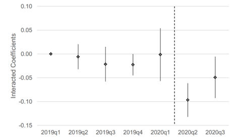 รูปที่ 1 แสดงการทดสอบสมมติฐานพื้นฐานของการวิเคราะห์ โดยเปรียบเทียบแนวโน้มการเปลี่ยนแปลงของราคาเสนอขายระหว่างผู้พัฒนาที่มีหนี้สูงและหนี้ต่ำ จะเห็นว่าก่อนเกิดวิกฤต (ไตรมาสที่ 1 ปี 2019 ถึงไตรมาสที่ 1 ปี 2020) จุดบนกราฟอยู่ใกล้เส้นศูนย์ แสดงว่าแนวโน้มการเปลี่ยนแปลงราคาของทั้งสองกลุ่มเป็นไปในทิศทางเดียวกัน ซึ่งเป็นเงื่อนไขสำคัญของการวิเคราะห์แบบ Difference-in-Differences แต่หลังเกิดวิกฤตและมีคำสั่งปิดสถานที่ (เส้นประแสดงไตรมาสที่ 2 ปี 2020) จุดบนกราฟเคลื่อนลงมาต่ำกว่าเส้นศูนย์อย่างชัดเจน แสดงว่าราคาของคอนโดจากผู้พัฒนาที่มีหนี้สูงลดลงมากกว่าผู้พัฒนาที่มีหนี้ต่ำ
