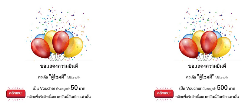 ผู้เข้าร่วมการทดลองจะเริ่มต้นจากการตอบคำถามทั่วไปเกี่ยวกับประสบการณ์ต่อกลโกงออนไลน์ และในระหว่างนั้นผู้เข้าร่วมการทดลองทุกคนจะเผชิญกับข้อความ pop-up (รูปที่ 3) ที่แสดงข้อความที่กระตุ้นอารมณ์ “โลภ” โดยการใช้คำว่า “ผู้โชคดี” และมีมูลค่าของรางวัลที่ชัดเจน ได้แก่ รางวัล 50 บาท และ 500 บาท ซึ่งจะถูกสุ่มให้แก่ผู้เข้าร่วมการทดลองแต่ละคน นอกจากนี้ ข้อความ pop-up มีการกดดันด้วยระยะเวลาในการรับสิทธิ์รางวัลที่ระบุว่า “รับสิทธิ์ได้แค่วันนี้วันเดียวเท่านั้น”