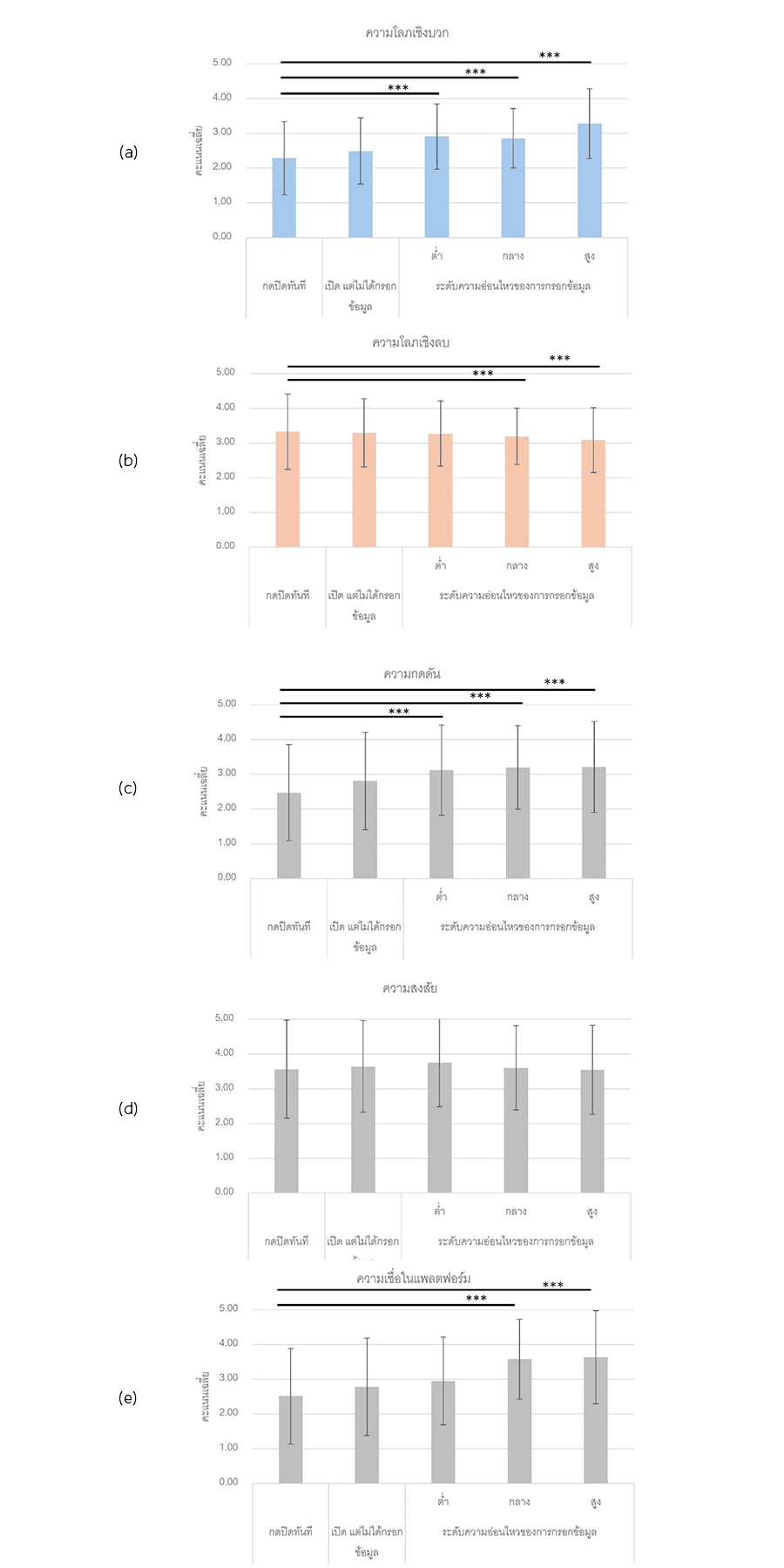 ในขณะที่ความกดดันขณะที่เผชิญกับข้อความก็มีคะแนนเฉลี่ยที่แตกต่างกันระหว่างกลุ่มผู้ที่ไม่กรอกข้อมูลและผู้ที่กรอกข้อมูล ส่วนความสงสัยตอนเห็นข้อความ pop-up นั้นไม่มีความแตกต่างกันระหว่างกลุ่ม แต่กลุ่มผู้ที่กรอกข้อมูลอ่อนไหวระดับต่ำมีแนวโน้มที่จะมีคะแนนความสงสัยค่อนข้างสูงกว่ากลุ่มอื่น อาจเป็นเพราะเริ่มไม่วางใจต่อข้อความ pop-up เมื่อต้องกรอกข้อมูลอ่อนไหวในระดับสูงขึ้น (รูปที่ 5 c-e)