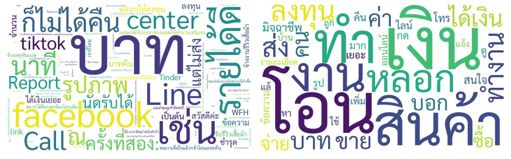 ในงานวิจัย กลุ่มตัวอย่างที่เคยมีประสบการณ์ต่อกลโกงออนไลน์ถูกสอบถามให้ระบุรายละเอียดเกี่ยวกับกลโกงออนไลน์ที่เคยเจอ โดยผู้วิจัยได้วิเคราะห์คำตอบและ แสดงคำตามจำนวนความถี่ (รูปที่ 2) และพบว่า ข้อความหรือรูปภาพของกลโกงที่มีความถี่สูงสามารถจำแนกออกได้เป็น 4 กลุ่ม ได้แก่ คำที่เกี่ยวข้องกับ