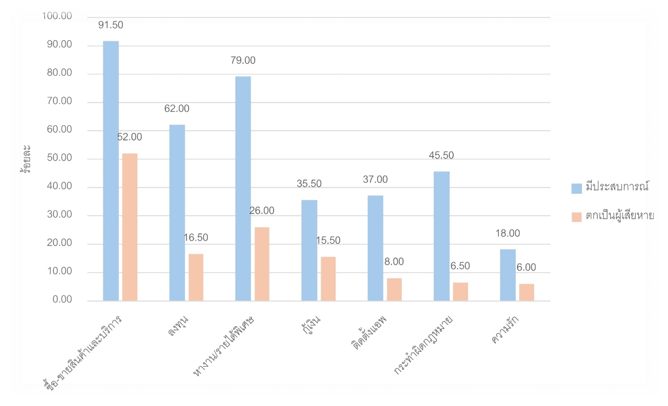 ในการศึกษาระยะแรก ผู้วิจัยได้เก็บรวบรวมข้อมูลด้วยแบบสอบถามจากกลุ่มตัวอย่างในกรุงเทพมหานครและปริมณฑลจำนวน 200 คน จากรูปที่ 1 พบว่า ผู้ตอบแบบสอบถามมากกว่าร้อยละ 90 มีประสบการณ์ถูกหลอกให้ซื้อ/ขายสินค้าหรือบริการ ซึ่งเป็นสัดส่วนสูงที่สุดเมื่อเทียบกับการหลอกประเภทอื่น และผู้ที่เคยถูกหลอกให้ซื้อ/ขายสินค้าหรือบริการนี้ยังตกเป็นผู้เสียหายในสัดส่วนที่สูงที่สุดคิดเป็นประมาณมากกว่าร้อยละ 50