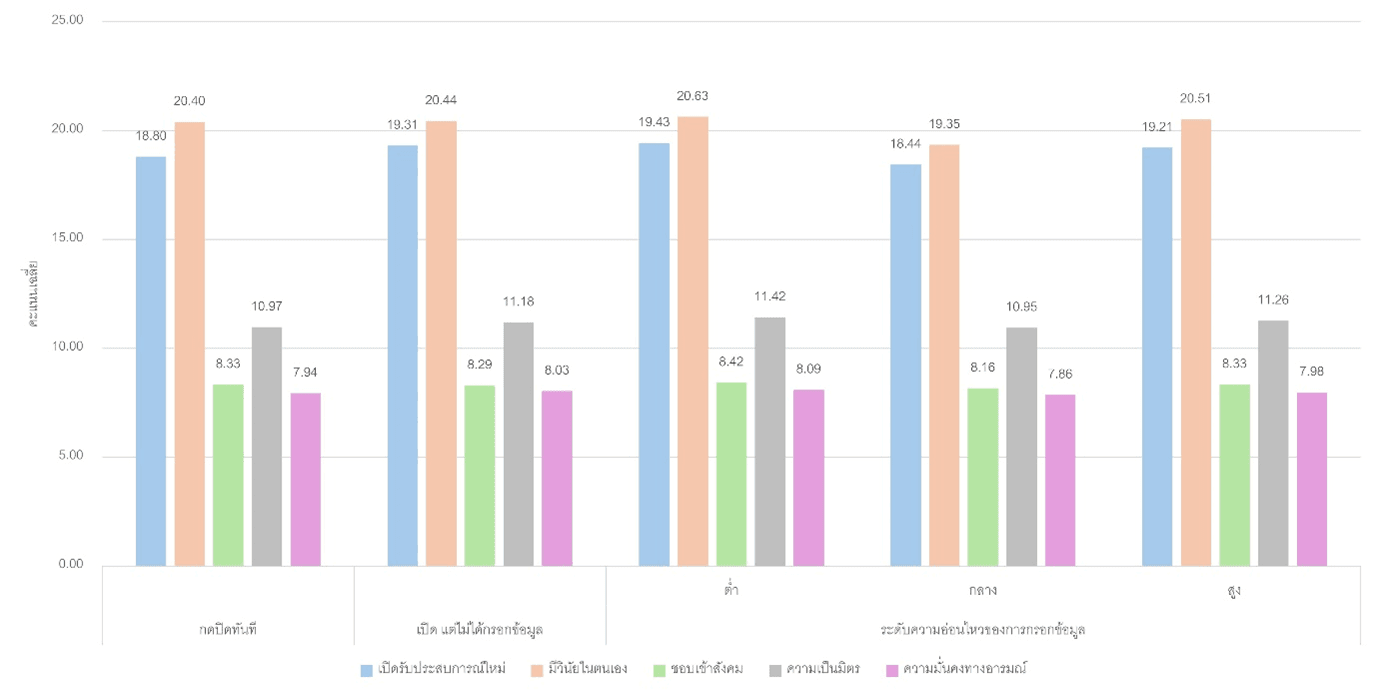 ซึ่งจากผลการศึกษาแสดงในรูปที่ 6 พบว่า คะแนนเฉลี่ยแต่ละบุคลิกภาพไม่มีความแตกต่างกันระหว่างกลุ่มผู้ที่กรอกข้อมูล