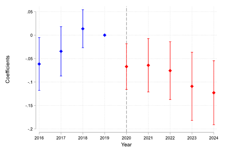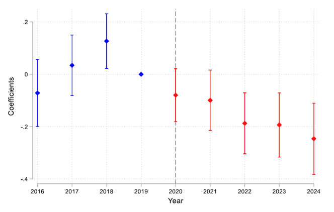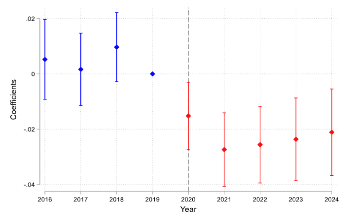 - มาตรการ CBAM ส่งผลให้สัดส่วนรายได้จากการส่งออกสินค้า CBAM ไปสหภาพยุโรปต่อรายได้ส่งออกรวมของบริษัทลดลง (รูปที่ 4) โดยในช่วงก่อนปี 2020 สัดส่วนรายได้จากการส่งออกสินค้า CBAM ไปสหภาพยุโรปต่อรายได้ส่งออกรวมของผู้ส่งออกในกลุ่ม treatment และผู้ส่งออกในกลุ่ม control ไม่ได้มีความแตกต่างกันอย่างมีนัยสำคัญ แต่หลังจากปี 2020 และปี 2023 ธุรกิจที่อยู่ในกลุ่ม treatment มีสัดส่วนรายได้จากการส่งออกสินค้า CBAM ไปยังสหภาพยุโรปต่อรายได้รวมลดลงเฉลี่ย 2.7% และ 2.6% ตามลำดับเมื่อเทียบกับธุรกิจที่อยู่ในกลุ่ม control