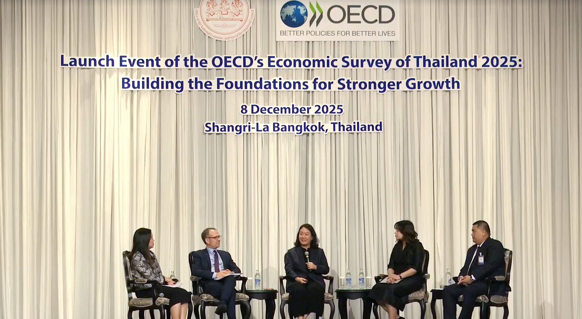 เมื่อวันที่ 8 ธันวาคม 2568 ดร.โสมรัศมิ์ จันทรัตน์ ผู้อำนวยการสถาบันวิจัยเศรษฐกิจป๋วย อึ๊งภากรณ์ ได้ร่วมเสวนาในหัวข้อ “การปรับโครงสร้างเศรษฐกิจไทยผ่านการยกระดับผลิตภาพการผลิต และการปฏิรูปเศรษฐกิจนอกระบบ” ในการประชุมเผยแพร่รายงาน Thailand’s Economic Survey 2025 ซึ่งจัดโดยสำนักงานสภาพัฒนาการเศรษฐกิจและสังคมแห่งชาติ (สศช.) และองค์การเพื่อความร่วมมือและการพัฒนาทางเศรษฐกิจ (OECD)