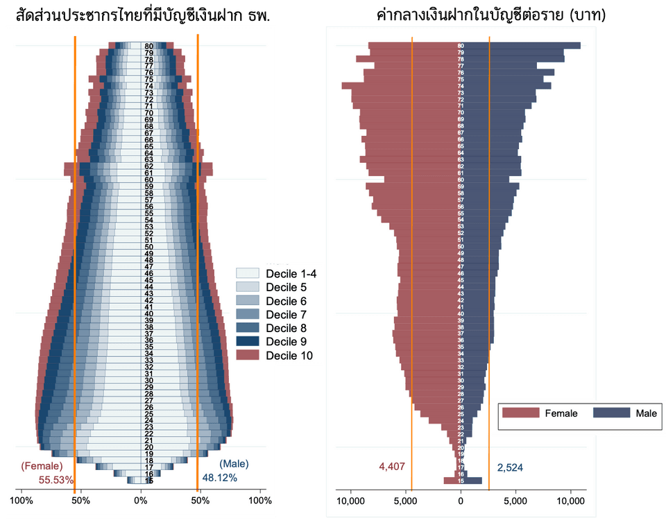 สัดส่วนของผู้หญิงไทยที่มีบัญชีเงินฝากธนาคารพาณิชย์จะมีสัดส่วนมากกว่าผู้ชายไทย และผู้หญิงก็มีเงินในบัญชีเงินฝากมากกว่าผู้ชายถึงสองเท่าในเกือบทุกช่วงอายุ ซึ่งตรงกันข้ามกับประเทศพัฒนาส่วนใหญ่ที่ผู้ชายจะมีเงินฝากมากกว่าผู้หญิง (1.3 เท่าในกรณีชาวอังกฤษ (NEST, 2018) หรือ 2.2 เท่ากรณีชาวอเมริกัน (Fed, 2017)) จากรูปที่ 3 เราเห็นถึงความแตกต่างของสัดส่วนความเป็นเจ้าของบัญชีเงินฝากและยอดเงินฝากในบัญชีระหว่างผู้หญิงและผู้ชายไทย โดยกว่าครึ่งของผู้หญิง (55.5%) จะเป็นเจ้าของบัญชีเงินฝาก และมีมากถึง 88.5% ในผู้หญิงอายุ 25 ปี ขณะที่สัดส่วนของผู้ชายมีไม่ถึงครึ่ง (48.1%) ที่มีบัญชีเงินฝาก และมากสุดในช่วงอายุ 23 ปี ที่ 77%