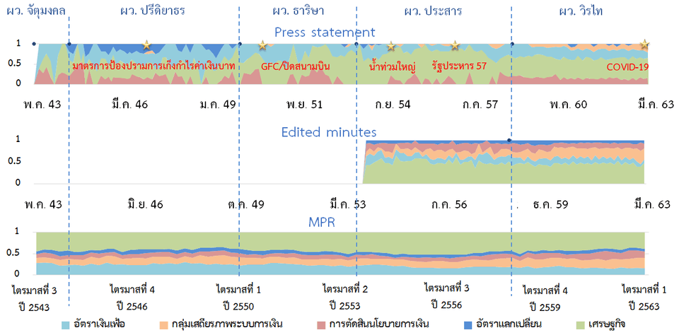 อาทิ ยุคของผู้ว่าการ ม.ร.ว. ปรีดิยาธร เทวกุล ให้น้ำหนักกับการสื่อสารหัวข้ออัตราแลกเปลี่ยนค่อนข้างมาก เนื่องจากเป็นช่วงที่ค่าเงินบาทแข็งจากเงินลงทุนในหลักทรัพย์ของนักลงทุนต่างชาติ ทำให้ ธปท. ต้องออกมาตรการป้องปรามการเก็งกำไรค่าเงินบาท หรือยุคของผู้ว่าการ วิรไท สันติประภพ ได้ให้น้ำหนักกับการสื่อสารหัวข้อเสถียรภาพระบบการเงินมากกว่าช่วงเวลาอื่น เนื่องจากเป็นช่วงเวลาที่เสถียรภาพระบบการเงินไทยมีความเสี่ยงหลายด้านในภาวะที่อัตราดอกเบี้ยอยู่ในระดับต่ำ อาทิ หนี้ครัวเรือนสูง อุปทานคงค้างและการเก็งกำไรในภาคอสังหาริมทรัพย์ รวมถึงความผันผวนในตลาดการเงินจากการแพร่ระบาดของโควิด-19 (ภาพที่ 1.3)