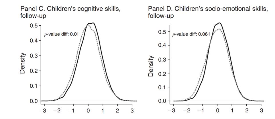 จากผลข้างต้น Attanasio et al. (2020) จึงได้รวมกลุ่มที่ได้รับการเยี่ยมบ้านและกลุ่มที่ได้รับทั้งคู่เป็นกลุ่มทดลอง ส่วนกลุ่มควบคุมเดิมและกลุ่มได้รับอาหารเสริมเป็นกลุ่มควบคุม รูปที่ 4 แสดงผลของการทดลองที่เกิดขึ้นกับทักษะด้านสติปัญญา (cognitive) และด้านสังคม-อารมณ์ (socio-emotional) ที่สำคัญงานวิจัยชิ้นนี้ได้พยายามตอบคำถามที่สำคัญคือ การส่งเสริมให้ผู้ปกครองทำกิจกรรมที่กระตุ้นพัฒนาการผ่านการเยี่ยมบ้านช่วยให้เด็กปฐมวัยมีพัฒนาการดีขึ้นได้อย่างไร? นักวิจัยพบว่า การส่งเสริมดังกล่าวส่งผลให้ผู้ปกครองจัดหาหรือลงทุนในด้านสื่ออุปกรณ์หรือของเล่น (material investment) มากขึ้นอย่างมีนัยสำคัญ แต่ไม่พบว่าส่งผลต่อการใช้เวลาทำกิจกรรมกับเด็กปฐมวัยของผู้ปกครอง (time investment) ซึ่งอาจจะดูน่าประหลาด แต่ส่วนหนึ่งน่าจะเป็นเพราะนักวิจัยมีเพียงข้อมูลปริมาณเวลาที่ผู้ปกครองทำกิจกรรม แต่ไม่สามารถเก็บข้อมูลด้านคุณภาพของกิจกรรมที่ผู้ปกครองทำกับเด็กได้ ทั้งที่คุณภาพของกิจกรรมมีความสำคัญมาก ผู้ปกครองอาจจะไม่ได้เพิ่มเวลาแต่ทำกิจกรรมที่มีคุณภาพมากขึ้น ซึ่งในขณะเดียวกัน กิจกรรมที่มีคุณภาพอาจจะต้องการสื่ออุปกรณ์หรือของเล่นที่ดีขึ้นและมากขึ้น ยังจำเป็นต้องมีงานวิจัยในกลุ่มตัวอย่างขนาดใหญ่ที่ช่วยตอบว่า การลงทุนในสื่ออุปกรณ์หรือการลงทุนด้านเวลามีประสิทธิภาพมากกว่ากัน หากสามารถตอบคำถามนี้ได้ น่าจะสามารถออกแบบนโยบายเพื่อลดความเหลื่อมล้ำตั้งแต่ปฐมวัยได้อย่างมีประสิทธิภาพมากยิ่งขึ้น