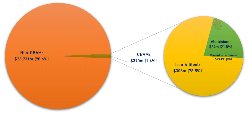 ในการวิเคราะห์ผลกระทบของ CBAM ต่อการส่งออกของไทยในแต่ละอุตสาหกรรมนั้น ผลกระทบขึ้นอยู่กับสองปัจจัยหลัก ได้แก่ การเปิดรับความเสี่ยง (exposure) และระดับความเข้มข้นของการปล่อยก๊าซเรือนกระจก (emission intensity) ของสินค้าส่งออกนั้น ๆ โดย exposure ต่อ CBAM นั้น อาจพิจารณาจากปริมาณและมูลค่าการส่งออกสินค้าที่อยู่ในขอบเขตของ CBAM ไปยังประเทศที่มีการใช้ CBAM หรือ BCA ซึ่งมีลักษณะคล้ายคลึงกัน นอกจากนี้ การวิเคราะห์ผลกระทบจำเป็นต้องคำนึงถึง emission intensity ของสินค้าที่อยู่ในขอบเขต CBAM หรือ BCA ด้วย ดังนั้น สินค้าที่ส่งออกที่มีปริมาณ มูลค่า และ emission intensity สูง ก็มีแนวโน้มที่จะได้รับผลกระทบจาก CBAM สูงด้วยเช่นกัน