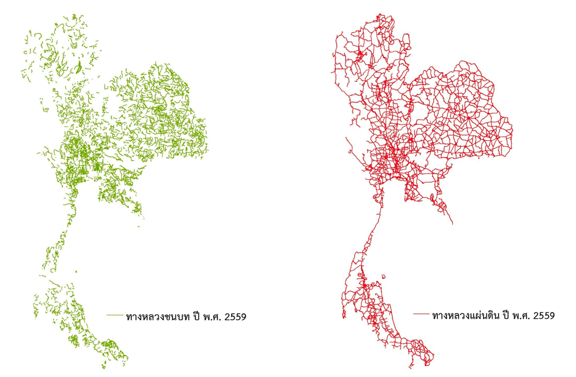 กราฟิกแสดงโครงข่ายทางหลวงชนบทและทางหลวงแผ่นดินในประเทศไทย ปี พ.ศ. 2559