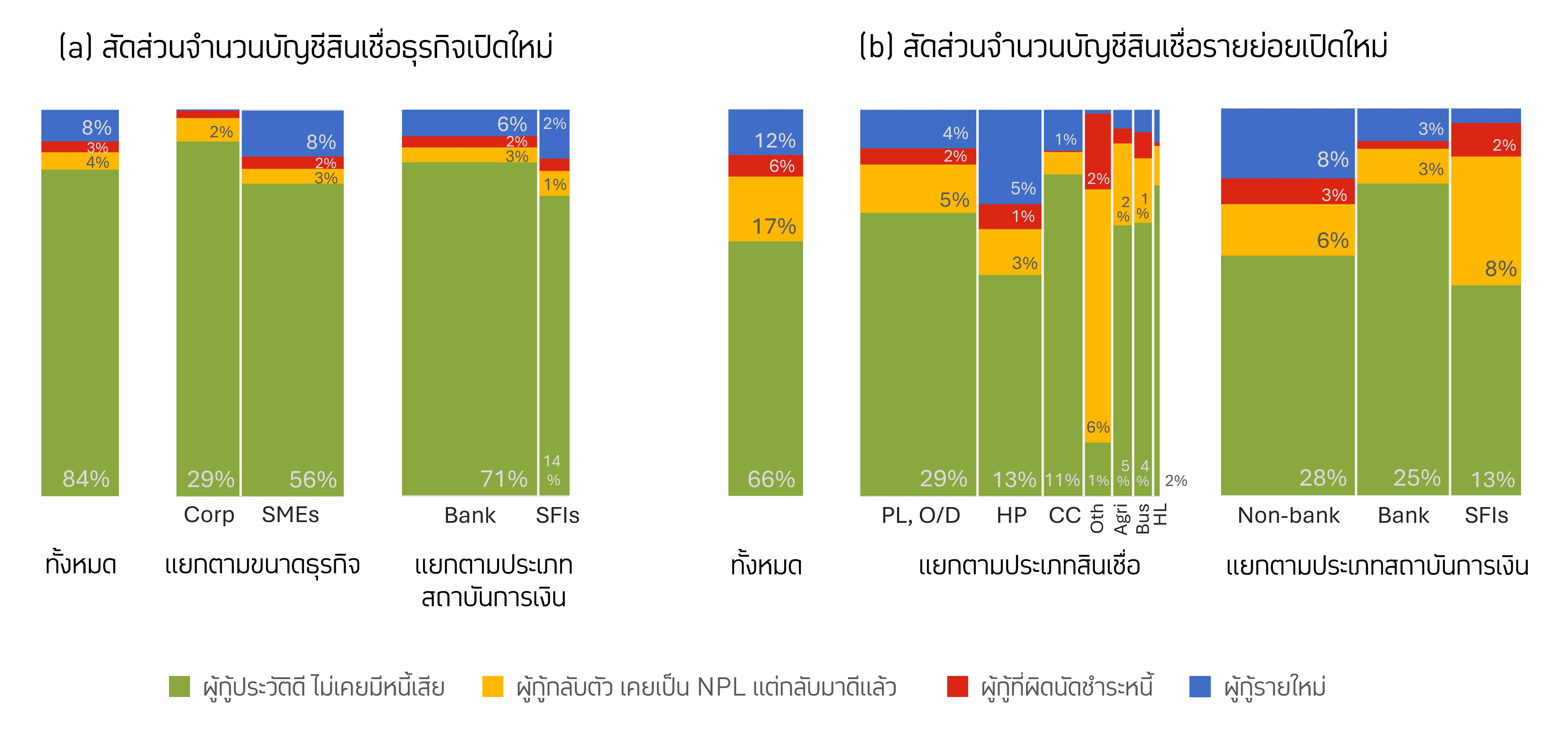 ผู้กู้กลับตัวที่เคยผิดนัดชำระหนี้มาก่อนและกลับมาจ่ายได้ตามปกติแล้ว ได้รับโอกาสมากน้อยเพียงใดในการได้สินเชื่อใหม่ เปรียบเทียบกับผู้กู้รายใหม่ที่ไม่เคยมีประวัติการกู้ในระบบมาก่อน? ข้อมูลสินเชื่อรายสัญญาที่ปล่อยใหม่ในปี 2566 ทั้งสินเชื่อธุรกิจจากข้อมูลที่ธนาคารพาณิชย์รายงานต่อธนาคารแห่งประเทศไทย และสินเชื่อรายย่อยจากข้อมูลเครดิตบูโร ในรูปที่ 1 แสดงให้เห็นว่า สถาบันการเงินยังให้ความสำคัญกับการปล่อยสินเชื่อใหม่ให้กับลูกหนี้ที่กลับตัว โดยหากมามองสินเชื่อรายย่อย พบว่า การปล่อยสินเชื่อใหม่โดยรวมนั้นให้แก่ผู้กู้กลับตัว (สีเหลือง) มากกว่าผู้กู้รายใหม่ที่ยังไม่เคยมีประวัติการกู้ในระบบ (สีน้ำเงิน) โดยเฉพาะสินเชื่อเพื่ออุปโภคบริโภค (PL, O/D) สินเชื่อจากสถาบันการเงินเฉพาะกิจ (Specialized Financial Institutions; SFIs) สินเชื่อเพื่อการเกษตร สินเชื่อเพื่อทำธุรกิจ (รวม Nano-finance) และสินเชื่ออื่น ๆ โดยในภาพรวม จากกลุ่มลูกหนี้กลับตัวทั้งหมด มี 34% ที่ได้สินเชื่อใหม่ในปี 2566 และสินเชื่อใหม่ที่ให้แก่ลูกหนี้กลับตัวมีทั้งให้กับลูกหนี้ที่กลับตัวมาไม่เกิน 1 ปี ซึ่งส่วนใหญ่เป็นลูกหนี้ SFIs ในสินเชื่อเกษตรและสินเชื่ออื่นๆ และลูกหนี้ Non-bank เช่าซื้อ ส่วนธนาคารพาณิชย์และ Non-bank บัตรเครดิต ส่วนใหญ่ให้สินเชื่อใหม่กับกลุ่มลูกหนี้ที่ออกจาก NPL มาแล้วมากกว่า 3 ปี