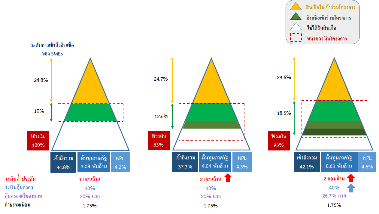 ดังนั้นการปรับเพิ่มค่าระดับความคุ้มครองจึงควรมีความสอดคล้องกับวงเงินของโครงการค้ำประกันสินเชื่อ การกำหนดค่าความคุ้มครองที่สูงเกินไปเมื่อเทียบกับวงเงินของโครงการนอกจากจะทำให้ต้นทุนของภาครัฐเพิ่มขึ้น และคุณภาพโดยรวมของ SMEs ในโครงการลดลงแล้ว การเข้าถึงสินเชื่อของกลุ่ม unbankable SMEs ก็จะปรับลดลงด้วย