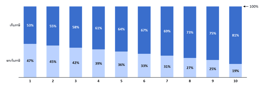ในกรณีที่สอง เมื่อนำการยกเว้นภาษีตามที่กฎหมายกำหนดมาพิจารณาร่วมด้วย ระดับความถดถอยลดลงอย่างมีนัยสำคัญ โดยความต่างของภาระภาษีระหว่างกลุ่มรายได้สูงสุดและต่ำสุดแคบลงเหลือเพียง 5% สะท้อนให้เห็นว่ามาตรการยกเว้นสามารถบรรเทาภาระให้แก่ครัวเรือนรายได้น้อยได้อย่างมีนัยสำคัญ