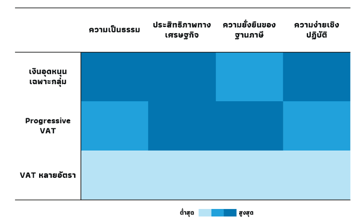 | ไม่มีมาตรการช่วยเหลือ | เงินอุดหนุนเฉพาะกลุ่ม | Progressive VAT | VAT หลายอัตรา | |