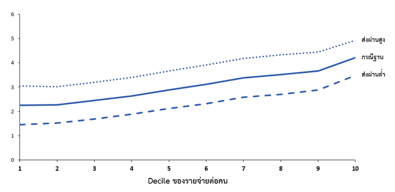 เมื่อทดสอบความอ่อนไหว (sensitivity tests) ภายใต้สมมติฐานที่ร้านค้านอกระบบส่งผ่านภาระภาษีในอัตรา 25% (ต่ำ) และ 75% (สูง) ผลการวิเคราะห์แสดงให้เห็นว่า ในทั้งสองกรณี โครงสร้างภาษีมูลค่าเพิ่มของไทยยังคงมีลักษณะใกล้เคียงกับภาษีสัดส่วนเช่นเดียวกับกรณีฐาน โดยค่า ETR มีความใกล้เคียงกันตลอดช่วงการกระจายรายได้ ทั้งนี้ในทุกกลุ่มรายได้ ค่า ETR ภายใต้สมมติฐานการส่งผ่านสูงจะอยู่ในระดับที่สูงกว่ากรณีการส่งผ่านต่ำ สะท้อนว่าระดับการส่งผ่านภาระภาษีมีผลกระทบต่อระดับภาระภาษีโดยรวม แต่ไม่ได้เปลี่ยนแปลงลักษณะการกระจายภาระภาษีอย่างมีนัยสำคัญ
