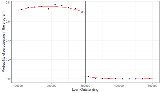 รูปที่ 2 แสดงความไม่ต่อเนื่อง ณ จุดตัดเกณฑ์ (RD gap)1 ที่ประมาณ 70% ซึ่งช่วยยืนยันว่าจุดตัดเกณฑ์สามารถกำหนดสถานะการเข้าร่วมมาตรการได้ รูปนี้ยังชี้ให้เห็นถึงความไม่ต่อเนื่องที่มีลักษณะคลุมเครือ (fuzzy) จากกรณี non-compliance ในทั้งสองฝั่งของจุดตัดเกณฑ์ เช่น มีลูกหนี้บางส่วนที่ผ่านคุณสมบัติตามเกณฑ์เชิงปริมาณ (ยอดคงค้างไม่เกิน 300,000 บาท) แต่ไม่ได้เข้าร่วมมาตรการ ซึ่งอาจเกิดจากการจำกัดวงเงินและวัตถุประสงค์ในการกู้เพิ่มกับ ธ.ก.ส. ที่อาจทำให้ลูกหนี้ที่มีความต้องการกู้เพิ่มในปริมาณมาก ๆ เลือกไม่เข้าร่วม หรือการไม่ผ่านเกณฑ์เชิงคุณภาพ เช่น มีสถานะเป็นบุคคลล้มละลาย
